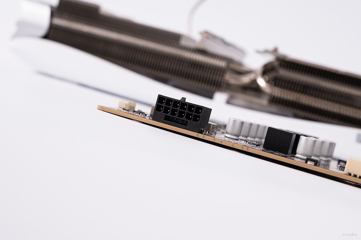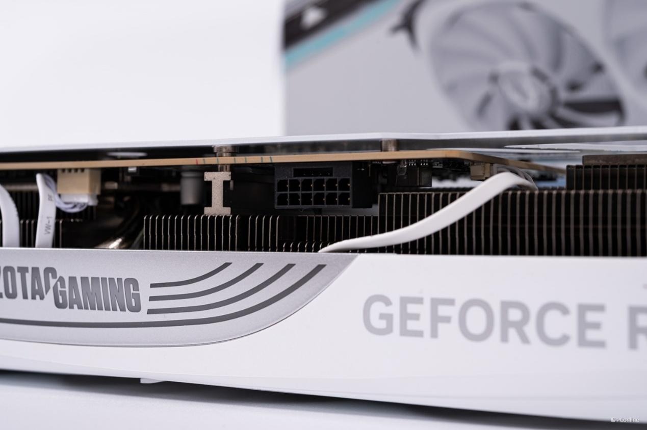 电源接口,我们熟悉的老朋友——12VHPWR接口,单口供电能力达到了600W,索泰RTX 4080 SUPER TRINITY OC月白最高功耗仅350W,完全能够满足需求。