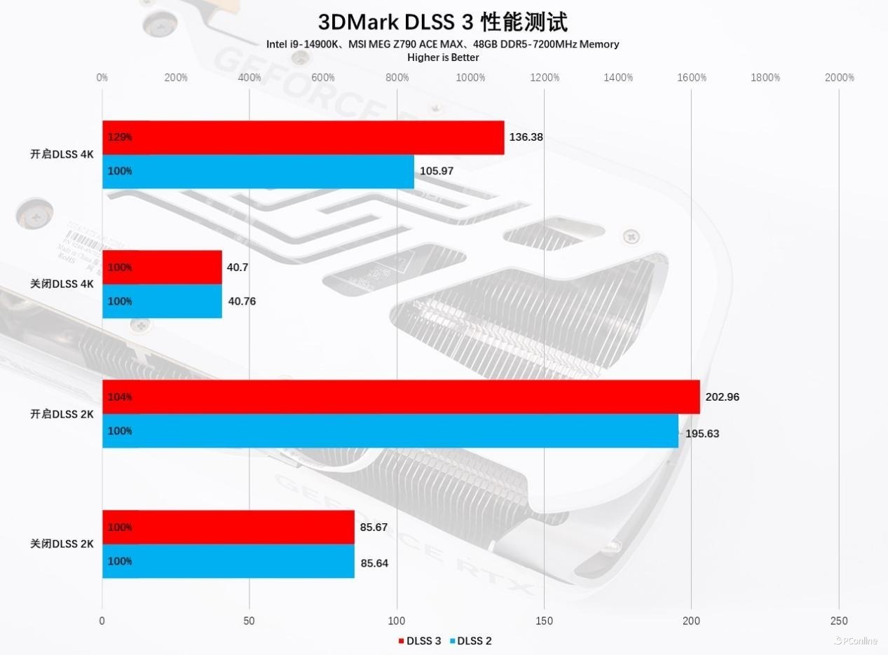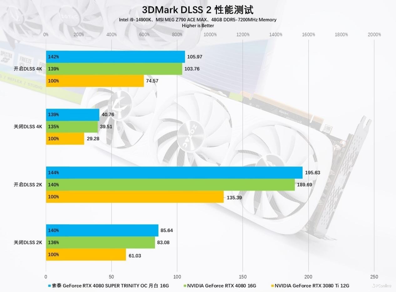 技术可以说相当厉害了,不过要有实际作用才行。先给大家看看3DMark的DLSS 3理论性能测试。实测索泰RTX 4080 SUPER TRINITY OC月白在DLSS 2下,4K只能做到105 FPS,开启DLSS 3后,136 FPS已经接近4K高刷游戏的需求了。2K就更不得了了,202 FPS完全就是超电竞的水准,不过索泰RTX 4080 SUPER TRINITY OC月白的用户应该都是标配4K显示器的,想要高刷4K游戏,买它就对了!