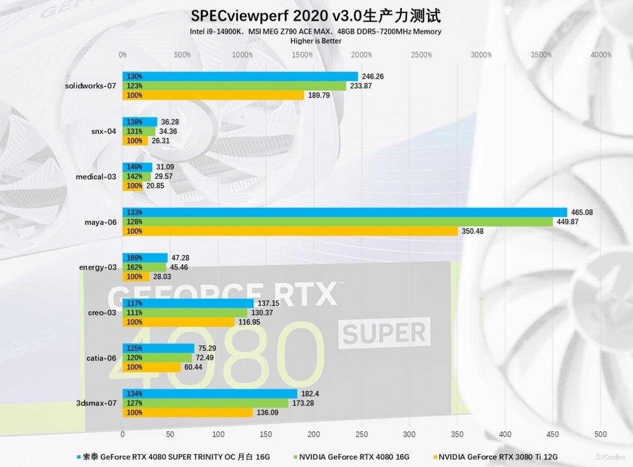在SPECviewperf 2020集成的8款工业软件测试中,索泰RTX 4080 SUPER TRINITY OC月白的表现依旧喜人,整体性能领先RTX 3080 Ti有40%左右,这也意味着渲染同一素材时,使用索泰RTX 4080 SUPER TRINITY OC月白可以缩短近三分之一以上的时间。