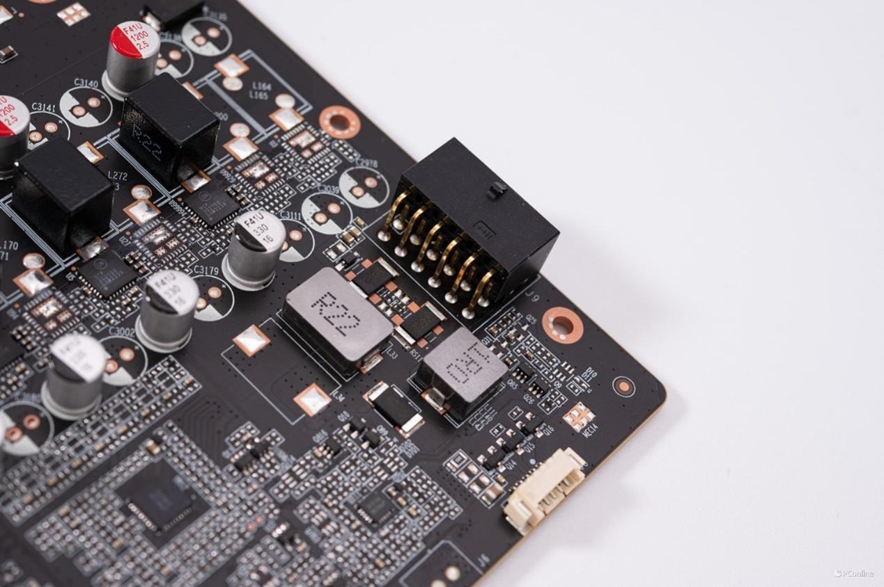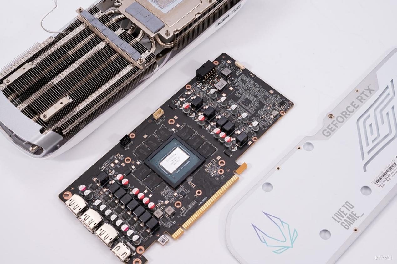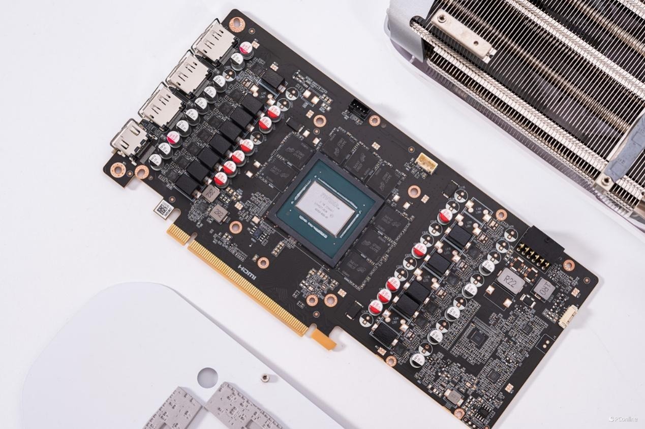 别看索泰RTX 4080 SUPER TRINITY OC月白的散热系统比较大,但它的PCB还是相当精致的。紧凑的短板型设计,并且整个功能电路区域的设计非常清晰明了,电子元件布局也非常工整,可见索泰在显卡设计的上的精湛的工艺。