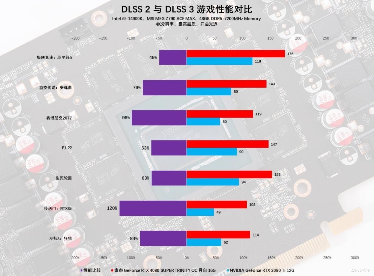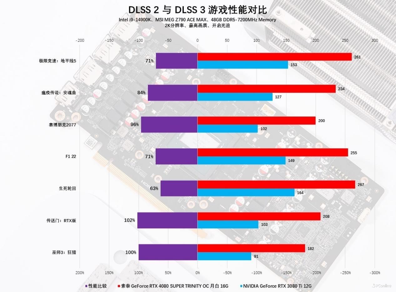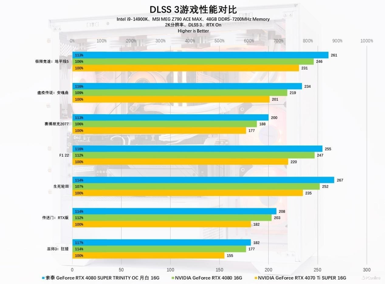按照惯例,我们也对2K分辨率进行了测试,实测在2K分辨率下,索泰RTX 4080 SUPER TRINITY OC月白开启DLSS 3以后,不少游戏的性能都是RTX 3080 Ti的两倍,就拿《传送门RTX版》来说,前代显卡开了DLSS 2以后能够达到100 FPS,而索泰RTX 4080 SUPER TRINITY OC月白开DLSS 3以后,208 FPS的成绩傲视群雄。