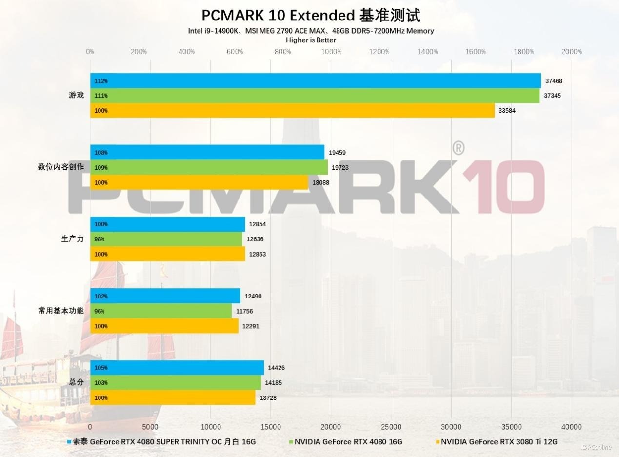 创作性能我们分为了多个方面,首先PCMark10 Extended测试中,索泰RTX 4080 SUPER TRINITY OC月白在游戏这个子项目上对比前代的RTX 3080 Ti有明显的优势,领先幅度高达12%,这也跟上述游戏性能测试结果相符。