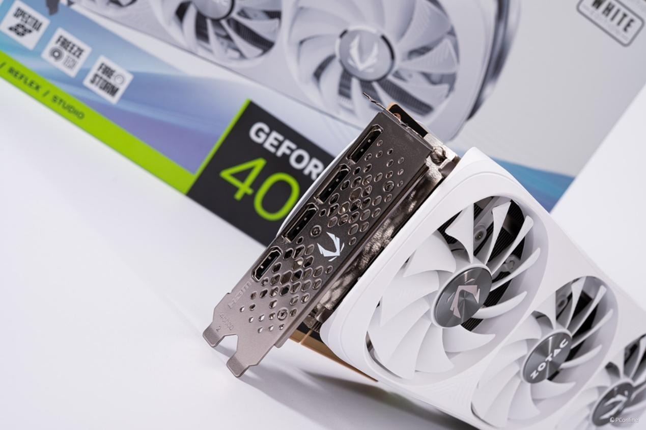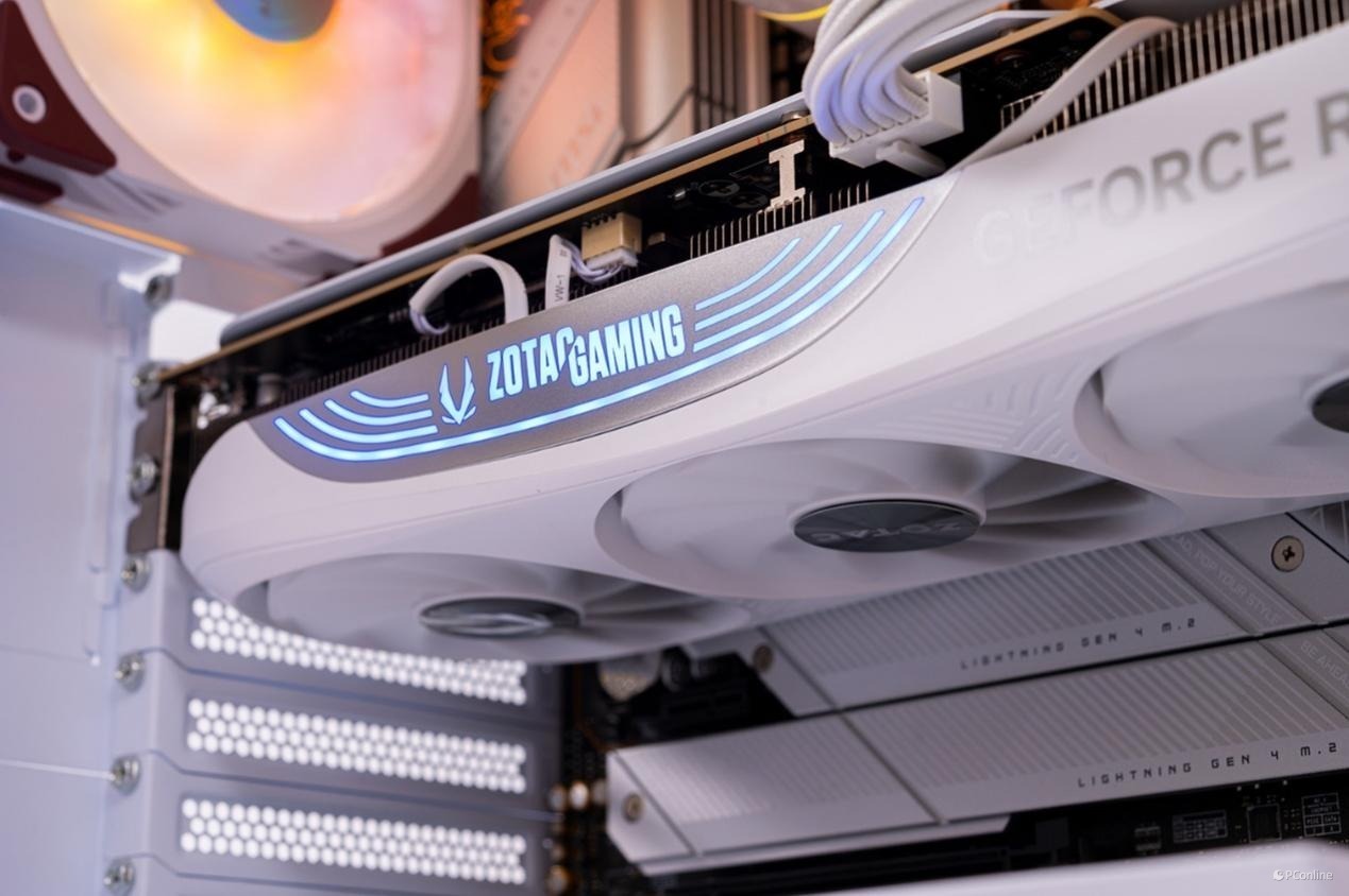 让我们继续看看索泰RTX 4080 SUPER TRINITY OC月白,顶部是常见的“GEFORCE RTX”字样,不过中央改为了“ZOTAC GAMING”字样,四周还有虹桥形状作衬,辨识度拉满。