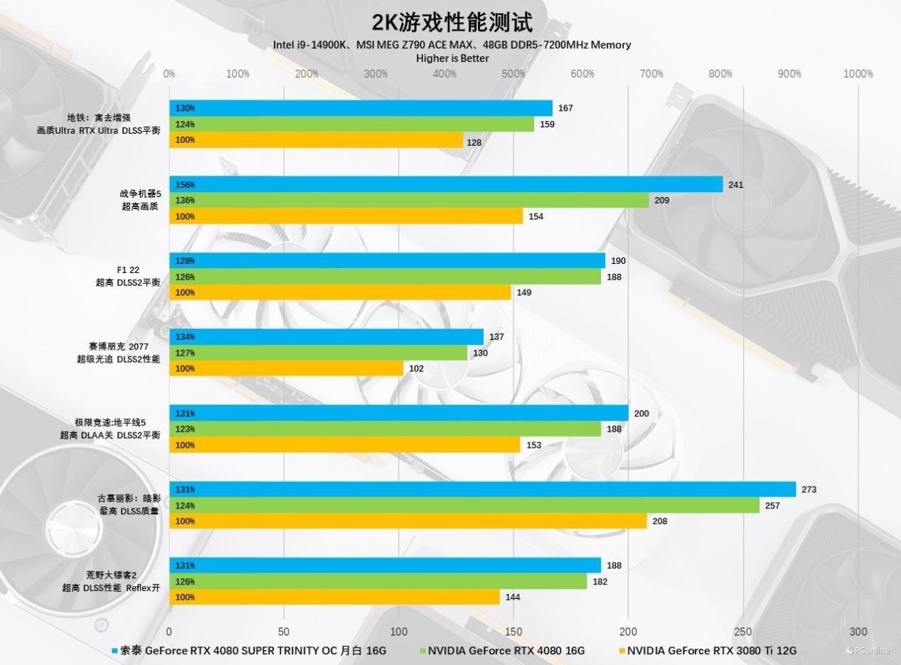 理论性能方面我们已经见识到了索泰RTX 4080 SUPER TRINITY OC月白的实力,那游戏表现呢?这次我们选择了多款游戏在2K与4K分辨率下进行实测,想必买得起这款显卡的玩家应该也不会配1080P的屏幕了吧。