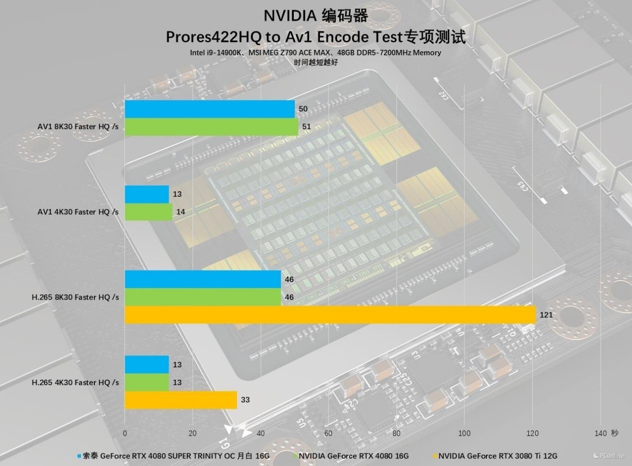 这里我们直接使用NVIDIA提供的8K片源与工程文件分别测试AV1格式和H.265格式下的编码时间。实测同一段素材下,同样使用H.265编码,第八代编码器果然名不虚传,索泰RTX 4080 SUPER TRINITY OC月白的效率是RTX 3080 Ti的3倍左右。AV1编码就更不用说了,前代的30系显卡甚至都不支持。