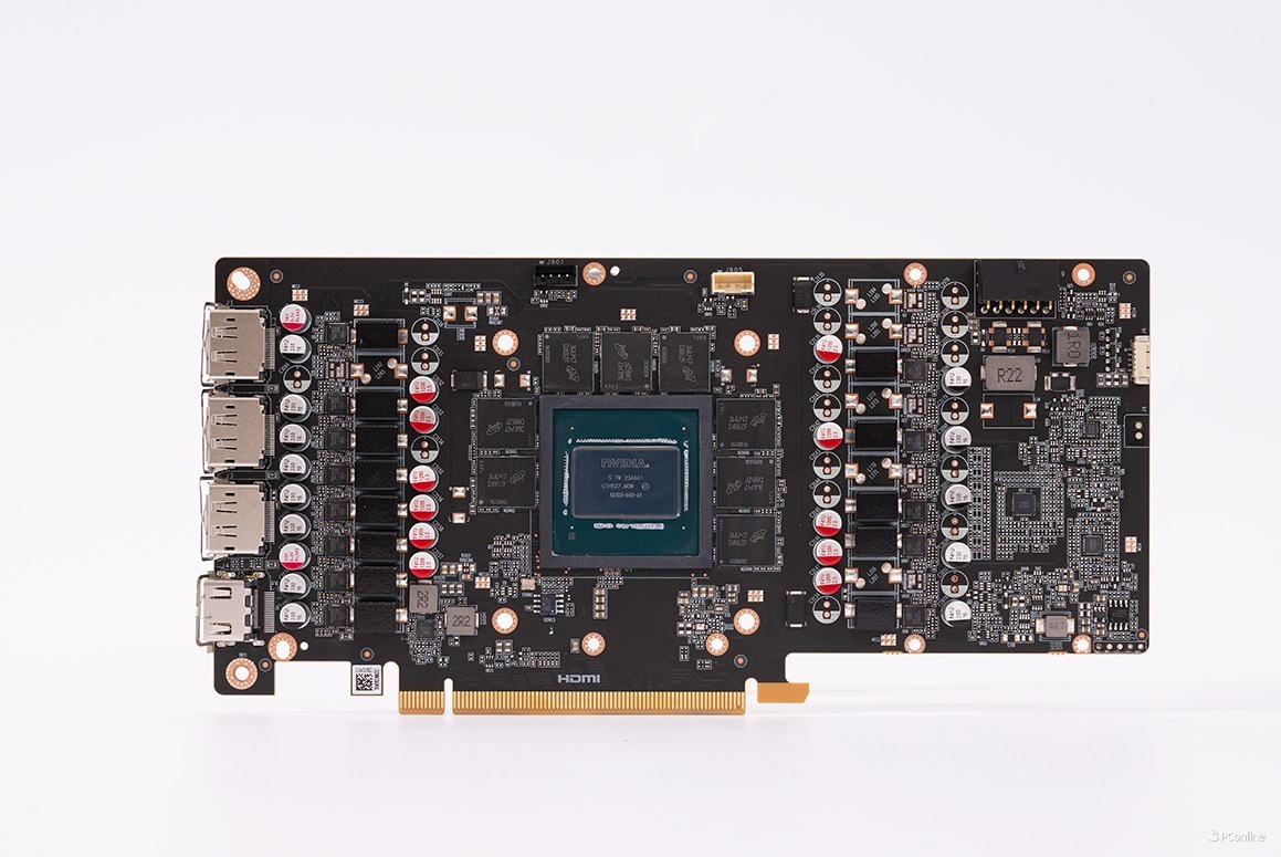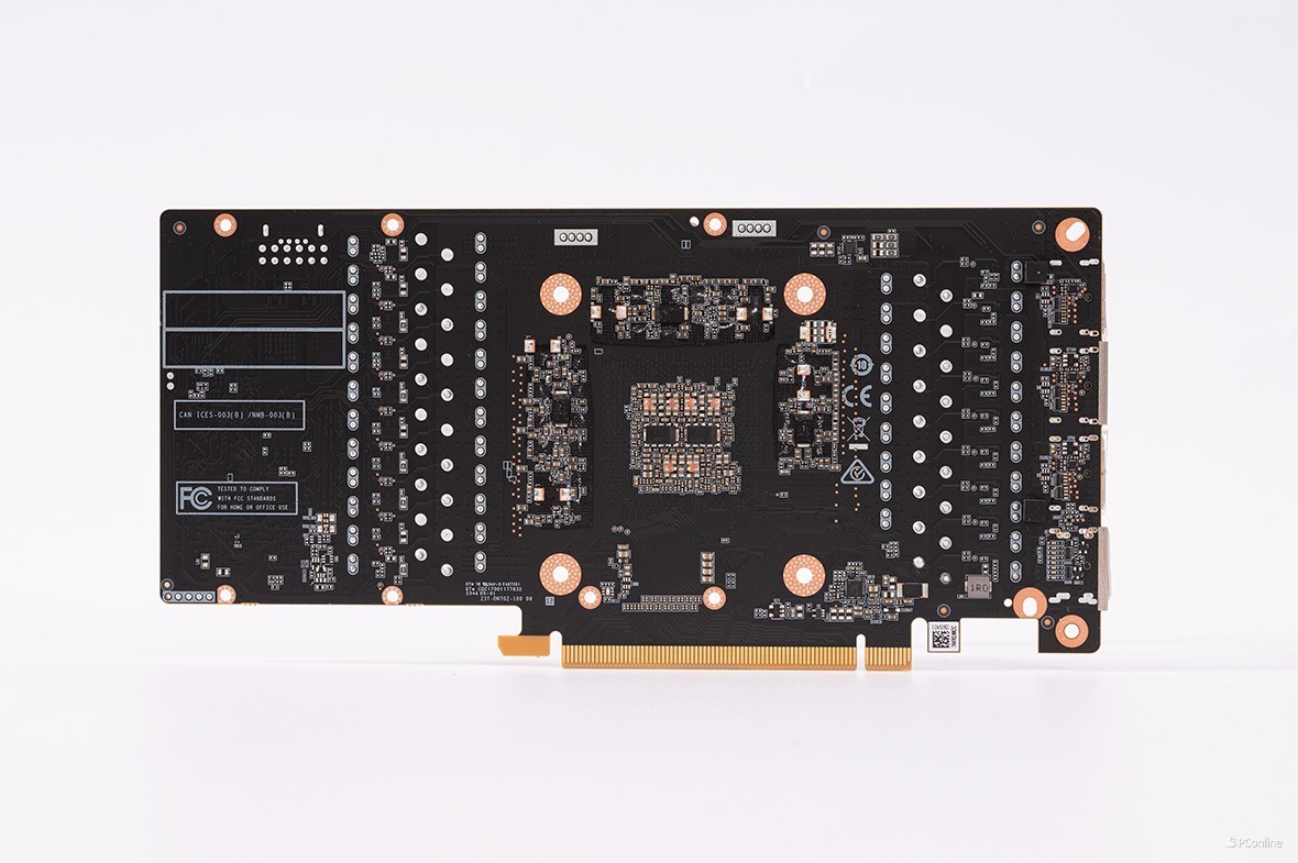 在金属背板的一侧还有镂空窗口设计,配合散热器上第三组风扇的风流能够直接穿透散热鳍片以及镂空的PCB,显著降低显卡温度。