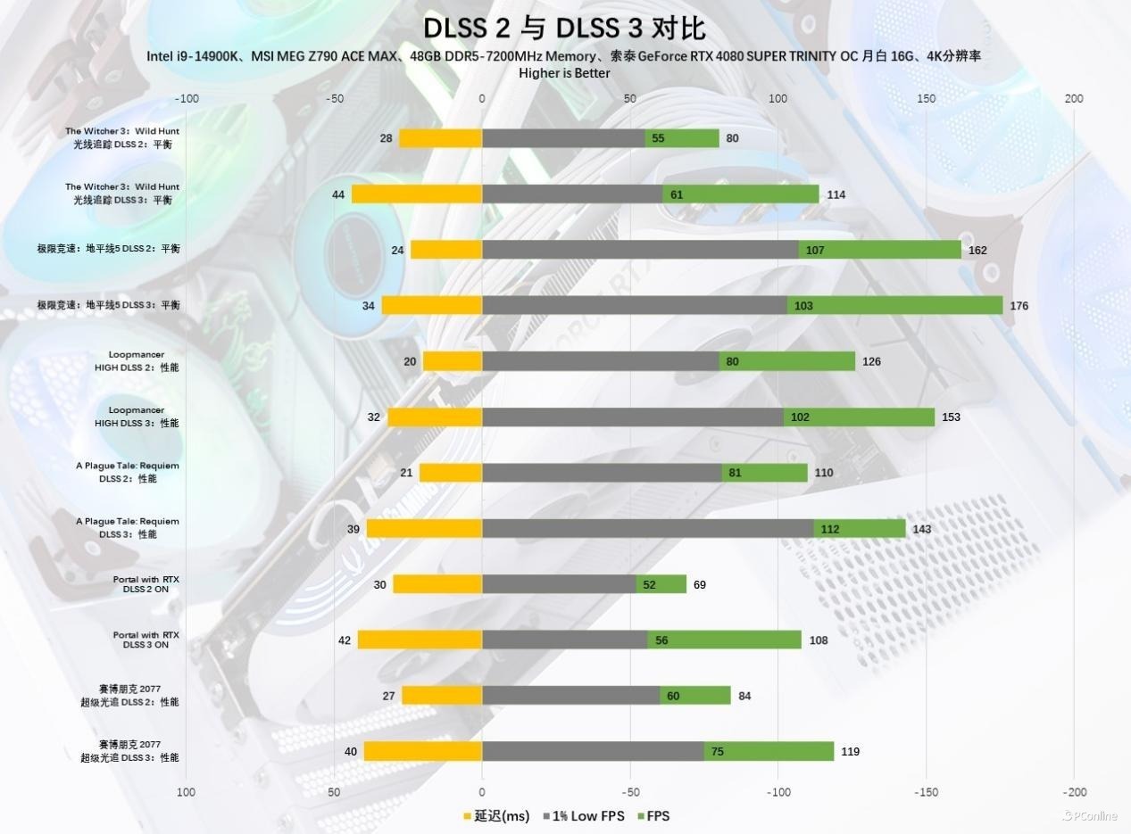 同样的,我们也对比了索泰RTX 4080 SUPER TRINITY OC月白在DLSS 2与DLSS 3下的性能差距,开启DLSS 3后,游戏帧数相比DLSS 2高出20-30帧,并且最重要的一点是,1%Low帧也有不同程度的提升,届时游戏体验也会更加流畅,卡顿掉帧的情况也会比较少见。