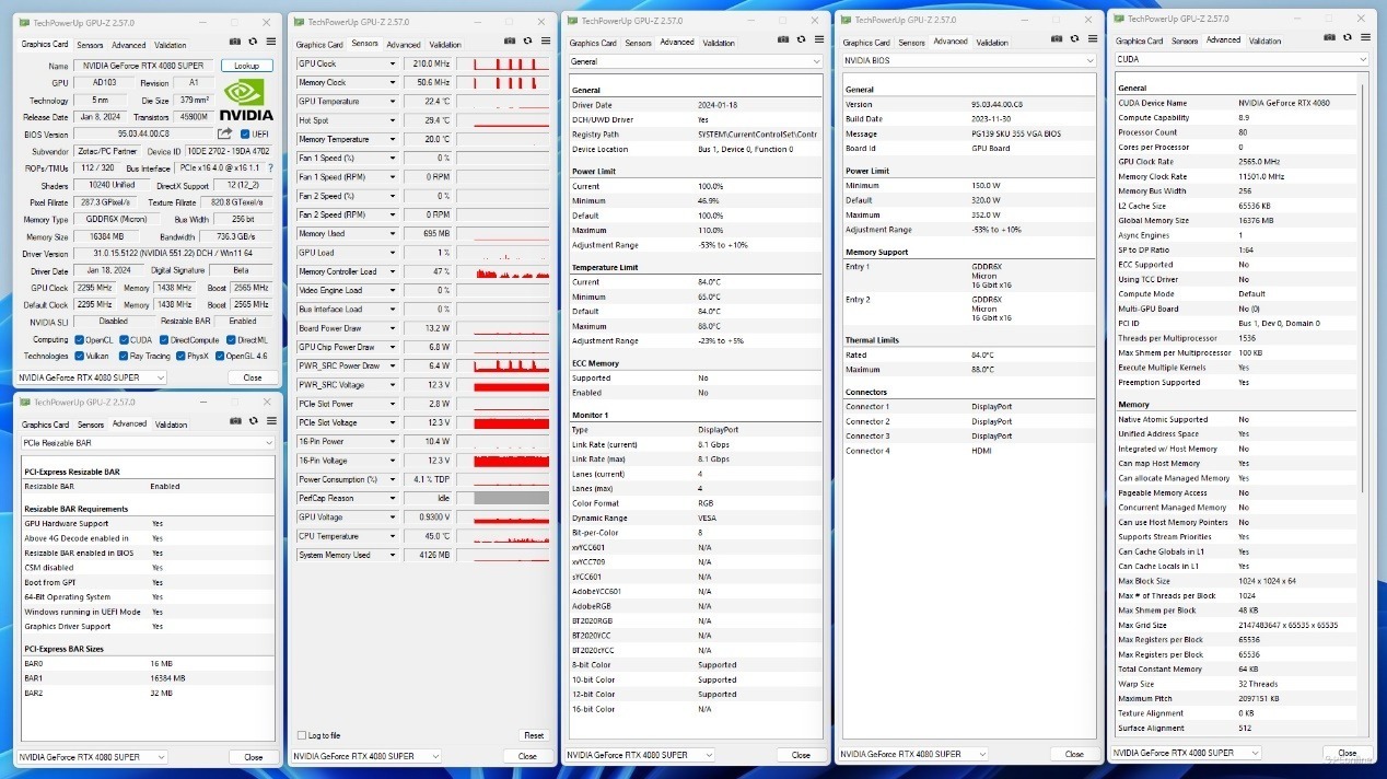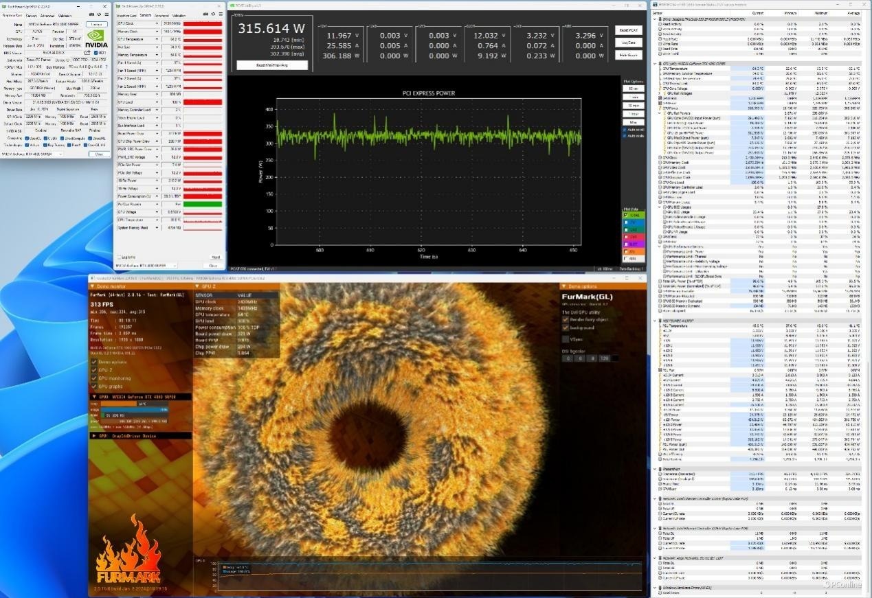 Furmark只能说明显卡在重度负载的情况下功耗表现,我们还使用HWINFO与PCAT工具对显卡对行功耗的监控。从不同的应用软件来看,索泰RTX 4080 SUPER TRINITY OC月白显卡功耗表现基本都是控制在TDP 320W以内。