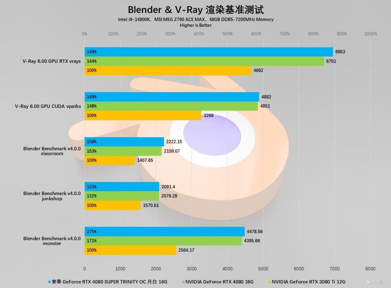 我们知道有的用户使用高端显卡用于建模、渲染、工业设计等领域,为此我们也测试了这方面比较具有代表性的软件。在N卡常用的Blender和V-Ray渲染软件中,索泰RTX 4080 SUPER TRINITY OC月白相比RTX 3080 Ti平均有50%的性能提升。跟RTX 4080比的话,差距就比较小了,不过看看它的售价,更低的价格更高的性能,其实还是不错的。