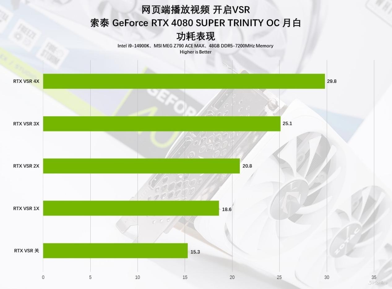 有用户可能担心功耗的问题,我们这里有实测了一下,使用浏览器在线观看视频的情况下,开启视频超分辨率(VSR) 4档,索泰RTX 4080 SUPER TRINITY OC月白的功耗仅有29-30W左右,基本可以忽略不计。如果你开启的是视频超分辨率(VSR) 1档,那功耗更是不足20W,所以日常观看一些老番或者清晰度比较差的视频时,笔者还是推荐你开启视频超分辨率(VSR),真的会让画质有一个“质的提升“。