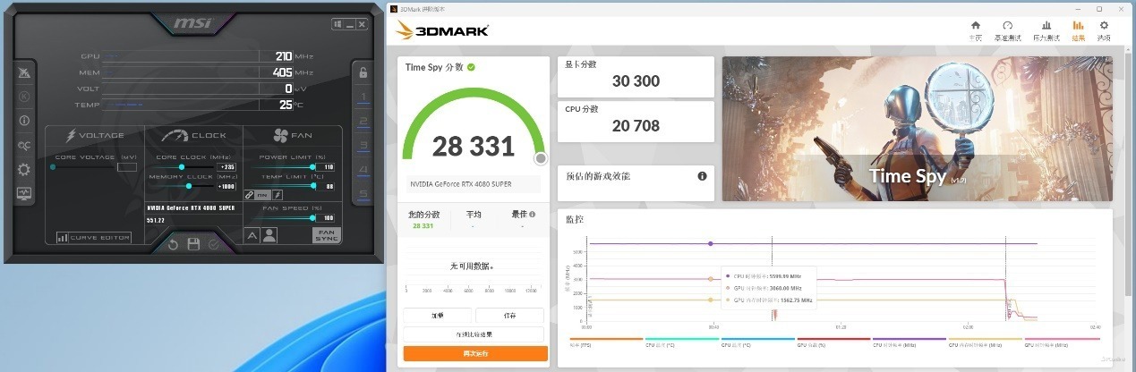 这还是这款显卡的极限,最后我们给核心提升了230MHz,显存也超频了1000MHz,这时候索泰RTX 4080 SUPER TRINITY OC月白终于站上了30000分的大关!不愧是旗舰级的显卡,超频潜力真的拉满!
