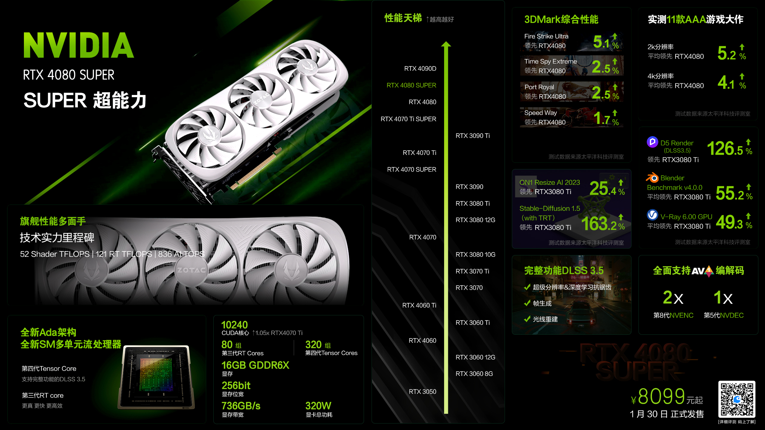 就在不久前,老黄给各位玩家带来了RTX 40系显卡的SUPER产品,前两周大家看到了RTX 4070 SUPER、RTX 4070 Ti SUPER的越级表现,后者更是直接换装了AD103核心,与RTX 4080站到了同一级别。不过SUPER系列还有最后一个重磅产品,那就是GeForce RTX 4080 SUPER。