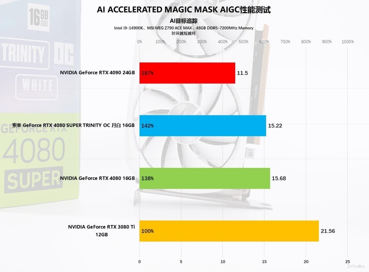 下面是基础的AI能力测试,使用达芬奇AI ACCELERATED MAGIC MASK测试时,可以看到索泰RTX 4080 SUPER TRINITY OC月白的完成时间为15.2秒,与RTX 4080的差距大概在5%左右。不过倒是比前代的RTX 3080 Ti快不少,后者需要21秒的时间,并且单从效率上来看,索泰RTX 4080 SUPER TRINITY OC月白基本比前代显卡快一半以上,这也就意味着在复杂项目里,将节省一半的时间。