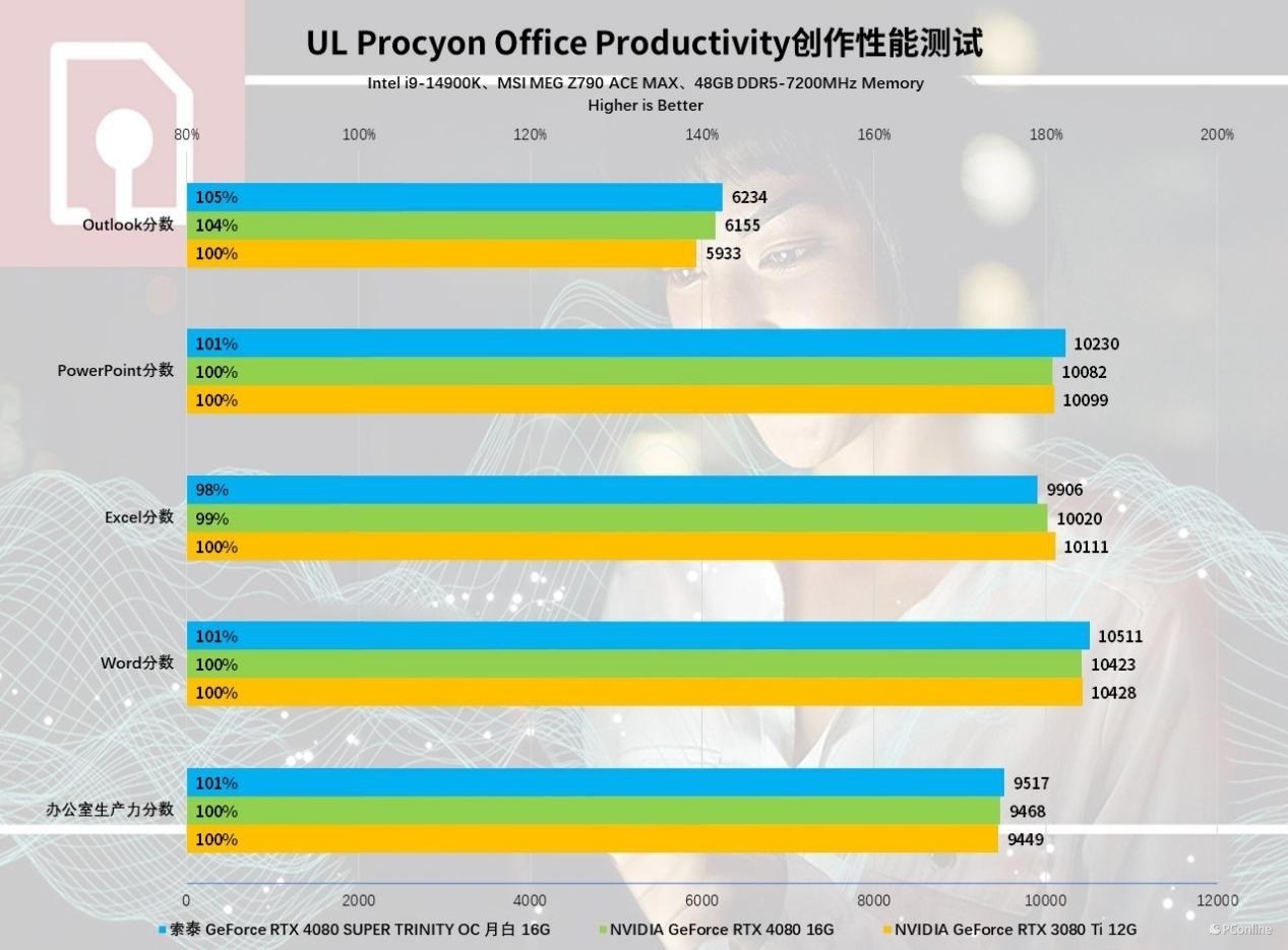 基础的办公生产力我们用UL Procyon进行测试,不过丝滑办公对这款显卡的压力都太小了,差距基本不太明显,不过索泰RTX 4080 SUPER TRINITY OC月白在部分项目依旧比RTX 3080 Ti强5%左右。