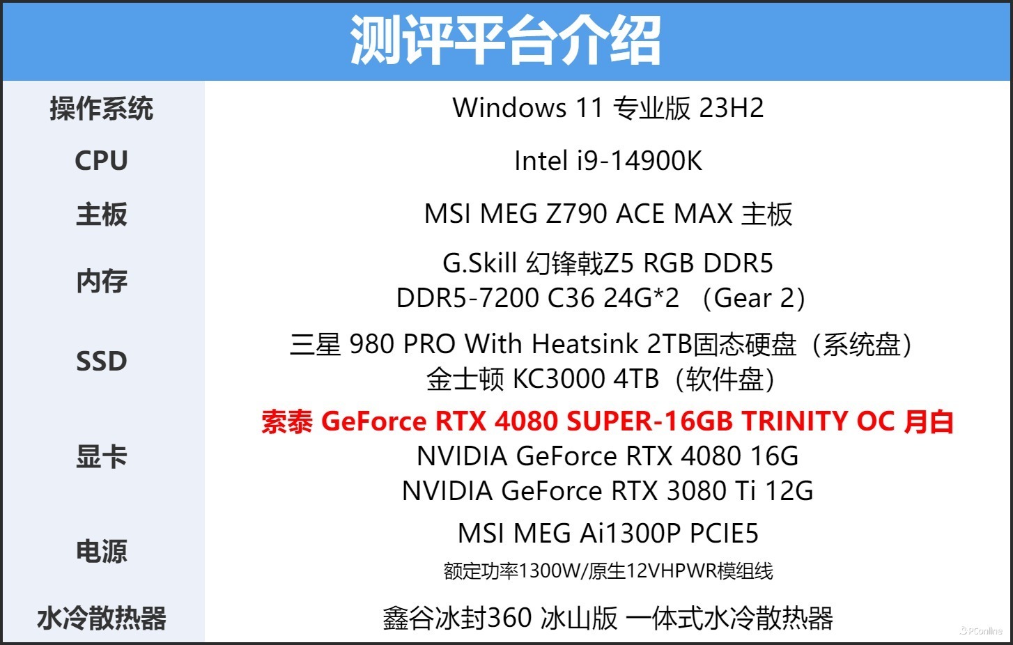 其他配置如上所示,都是时下最顶级的配置,这样才能让索泰RTX 4080 SUPER TRINITY OC月白发挥出全部的实力。