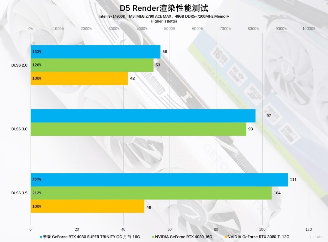 索泰GeForce RTX 4080 SUPER-16GB TRINITY OC月白的性能则是它的另一大优点,满血的AD103核心给予了它澎湃的性能表现,更高的频率更强的显存速率以及更多的核心规模,让它与前代RTX 3080 Ti拉开了更大的差距,开启DLSS 3以后,甚至有的游戏性能差距可以来到2倍以上!与RTX 4080相比,仍然有约5%的性能领先,这一点与其CUDA数量增幅一致,符合预期。