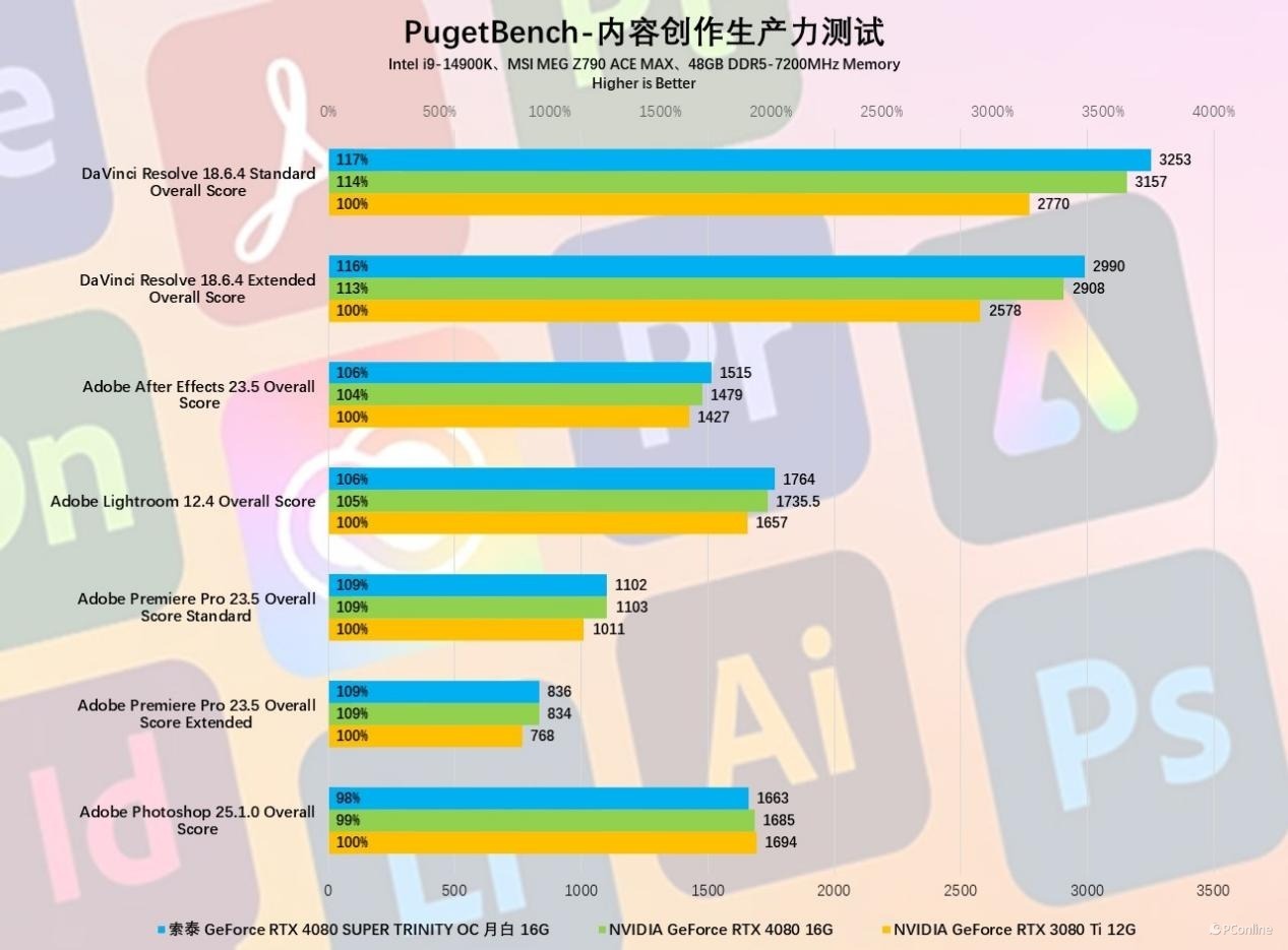 在Adobe或达芬奇等软件的Benchmark中,索泰RTX 4080 SUPER TRINITY OC月白的表现也毫不逊色,特别是在达芬奇里,因为有了AVI编解码的支持,索泰RTX 4080 SUPER TRINITY OC月白的性能相比RTX 3080 Ti足足提升了近20%,换装新显卡无疑能够大幅提升你的工作效率!