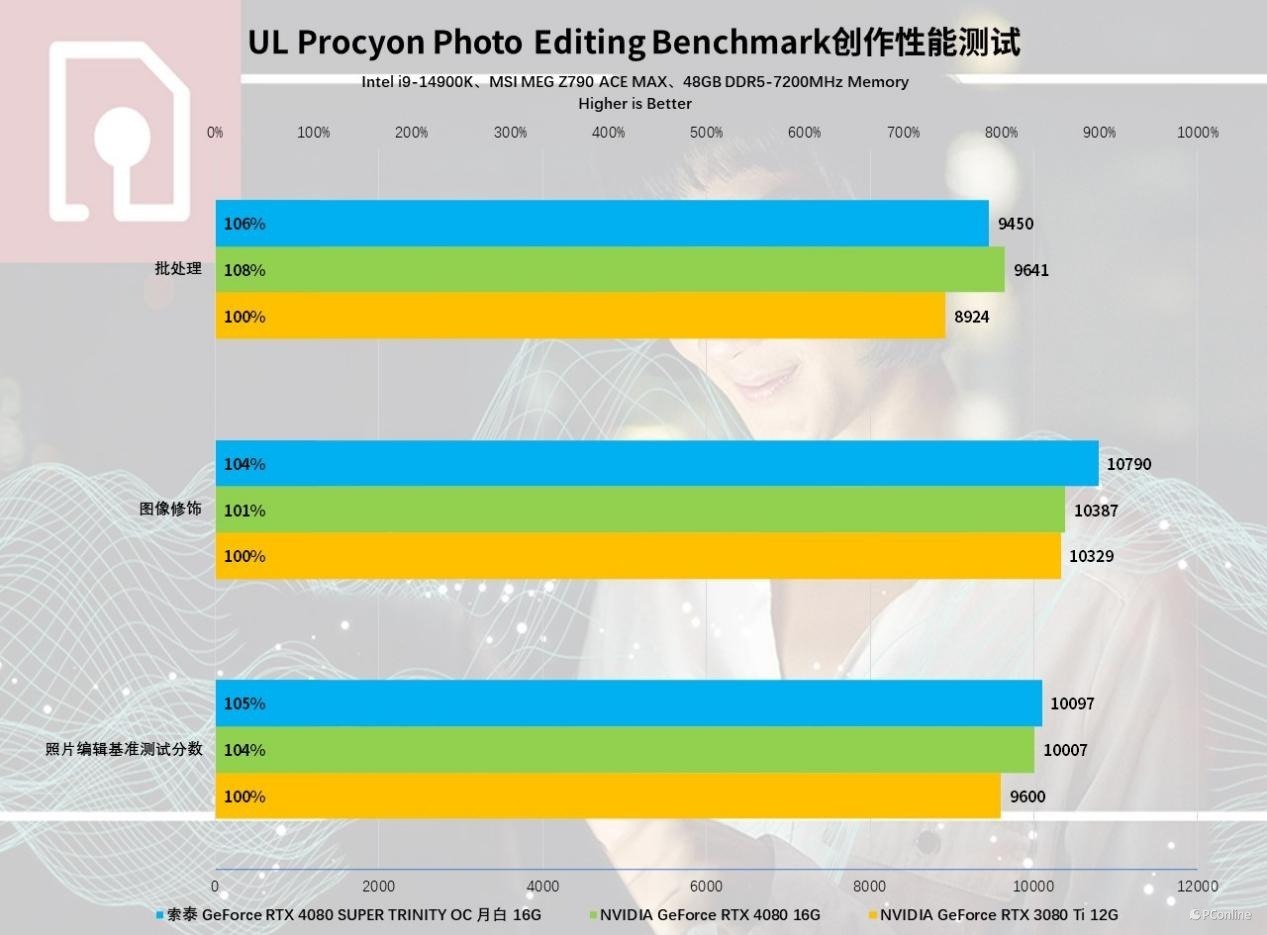 图像编辑也基本差不多,索泰RTX 4080 SUPER TRINITY OC月白的领先幅度在5%左右,与RTX 4080也只是伯仲之间。