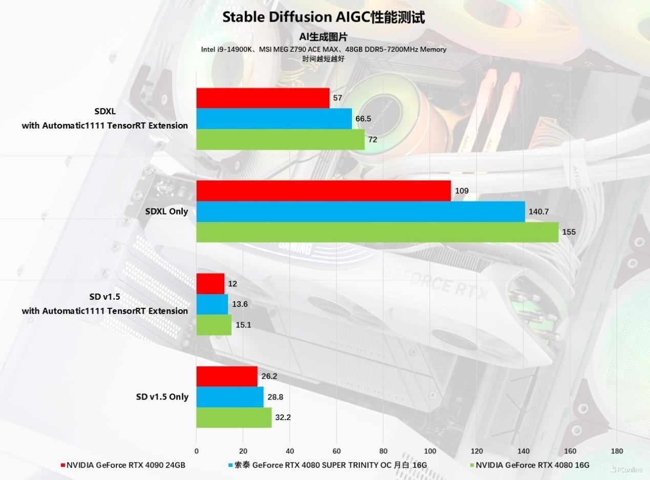 对比其他显卡来说,索泰RTX 4080 SUPER TRINITY OC月白的表现完全可以用出色来形容,其无论是在SD 1.5模型还是SDXL模型下,都比RTX 4080快上不少。并且得益于NVIDIA多年来在AI领域的不断耕耘,其缔造的CUDA生态更是AI界不容小觑的力量。在这个以ChatGPT为首的AIGC大行其道的时代,想要用AI创作离不开显卡的加持,索泰RTX 4080 SUPER TRINITY OC月白得益于更强的性能释放与大容量显存的加持,在AI上大有作为。