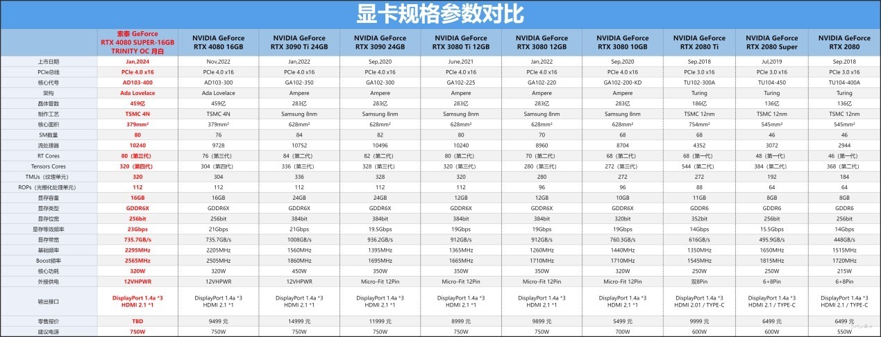 该看主角了,索泰RTX 4080 SUPER TRINITY OC月白上使用的是AD103-400-A1核心,这是一颗满血的AD103核心,由TSMC 4N工艺制造,内含10240个CUDA核心,Boost频率出厂就可达到2565MHz,性能表现更是逆天,绝对碾压前代卡皇RTX 3090 Ti。