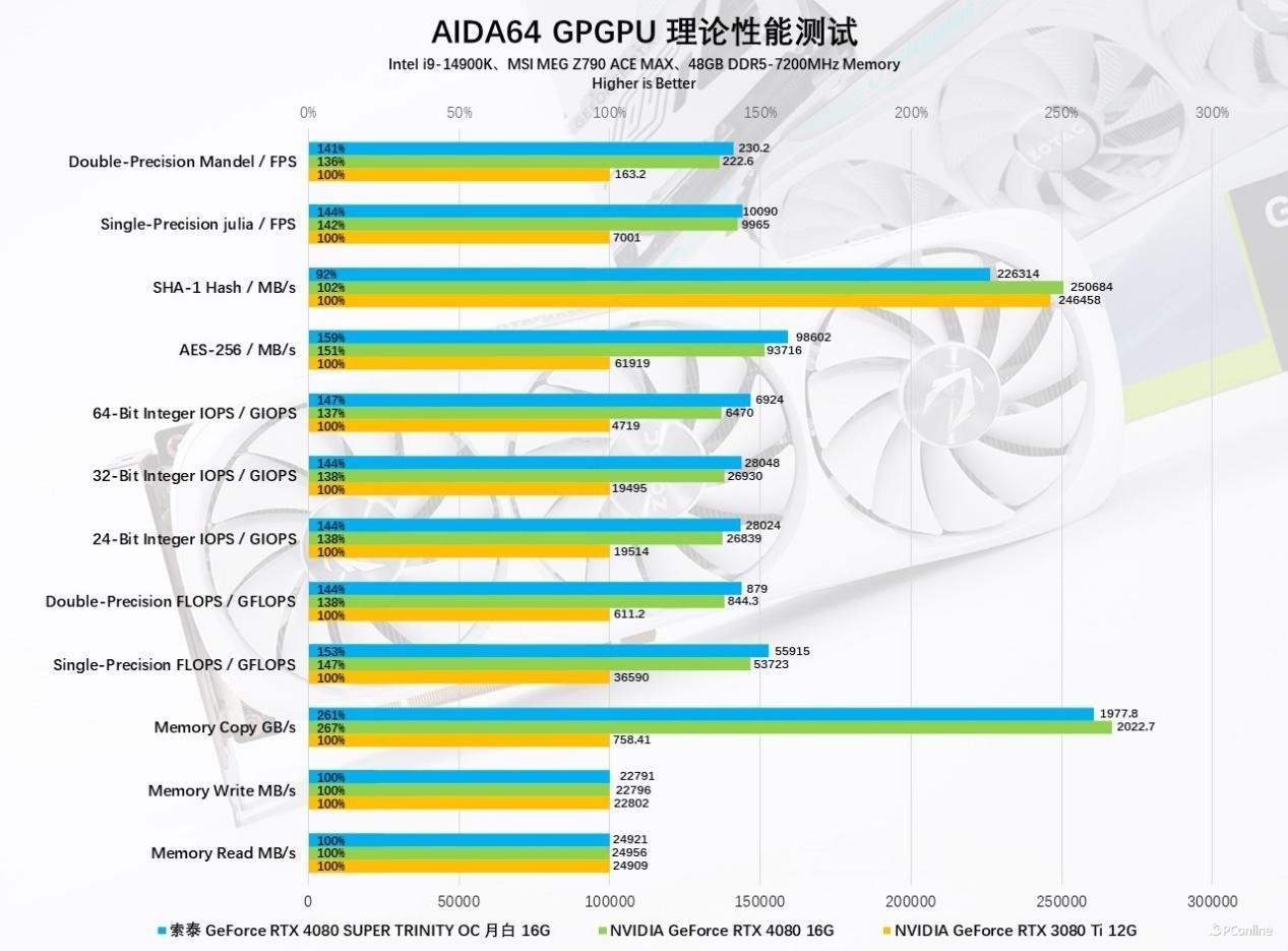 科学计算方面,索泰RTX 4080 SUPER TRINITY OC月白换装了新架构确实不一样,突出的性能表现展现了新显卡的超强实力,其单精度和双精度浮点运算基本是前代的40%以上,甚至部分项目也能超越RTX 4080 10%以上!