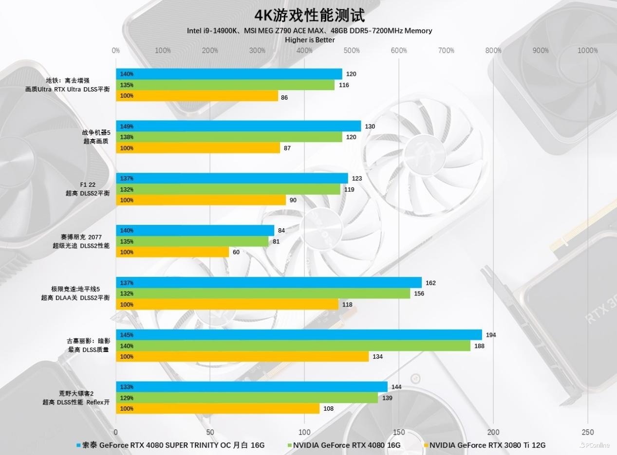4K分辨率下,索泰RTX 4080 SUPER TRINITY OC月白依旧强势,进一步扩大了二者的性能差距,这次整体性能领先已经突破了40%。像《赛博朋克2077》这种几乎没有优化的游戏,索泰RTX 4080 SUPER TRINITY OC月白在超级光追画质下凭借DLSS 2依旧可以有接近90 FPS的游戏体验,而前代显卡甚至60 FPS都不到,差距还是很明显的。对比RTX 4080的话,大部分游戏在4K分辨率下,也有5%的性能领先。