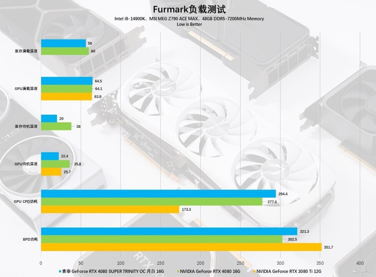 相较几款横向对比的显卡,在Furmark烤机方面,索泰RTX 4080 SUPER TRINITY OC月白的功耗也维持在较低的水平。不得不说索泰这个ICESTORM 2.0散热系统确实厉害,即便是这么高规格的显卡,都能将温度控制在较低的水平。