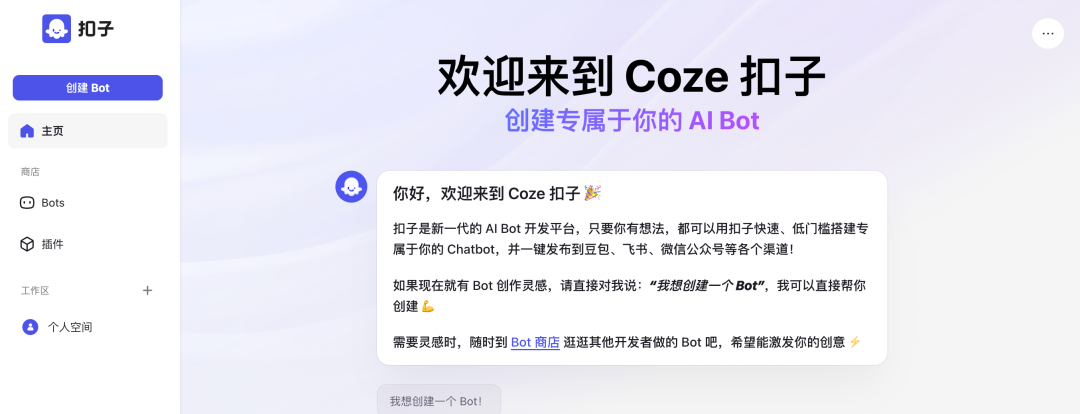 除了可以创建自己的 Chatbot,Coze 官方还提供了 Bots 商店和插件。