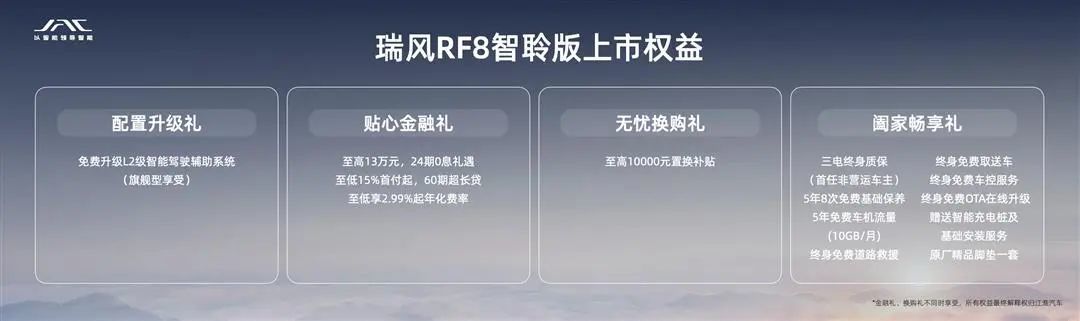 1月31日,诚意之上再添诚意,内卷之后继续内卷,瑞风RF8智聆版以16.99-23.99万元的售价区间上市,燃油尊享型16.99万元,燃油旗舰型18.99万元,PHEV尊贵型21.99万元,PHEV顶配23.99万元。同时鸿蒙版开启预售,预售价格区间为20.99-25.99万元,并将于4月开启交付。