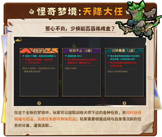 在新增怪奇梦境选项【天降大任】中,玩家可以从随机出现的“训练大师”处接取挑战任务,尝试借用轮回之力,将祝福与厄运独揽于身。如此与虎谋皮,自然是危险与机遇并存,只要你能承受厄运诅咒,成功完成挑战,便会移除厄运,脱胎换骨,实力更进一步!可一旦任务失败,厄运将永远伴随你的左右,直到挑战尽头。