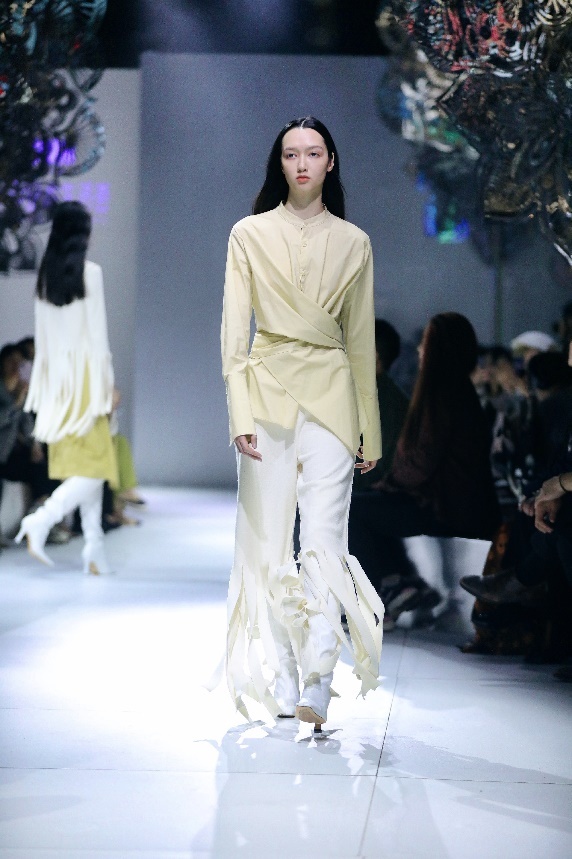 作为大秀首个深圳本土品牌,Vmajor借用男装的概念设计女装来启发摩登女性态度,通过干练廓型结合淡雅的配色与细腻的结构剪裁,传达出女性的“柔韧”力量。