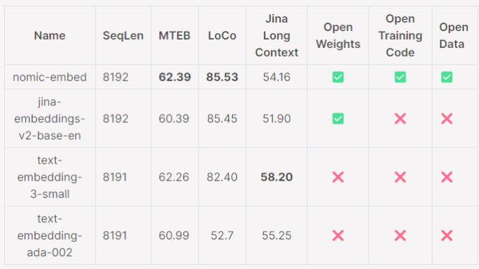 1. 🏆 Nomic Embed在短文和长文任务中胜过OpenAI的Ada-002和text-embedding-3-small模型。