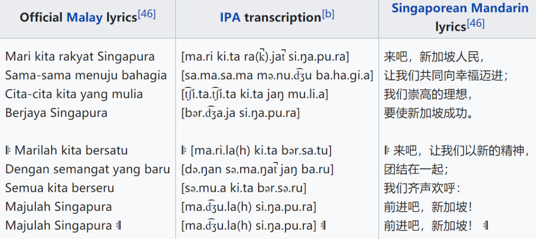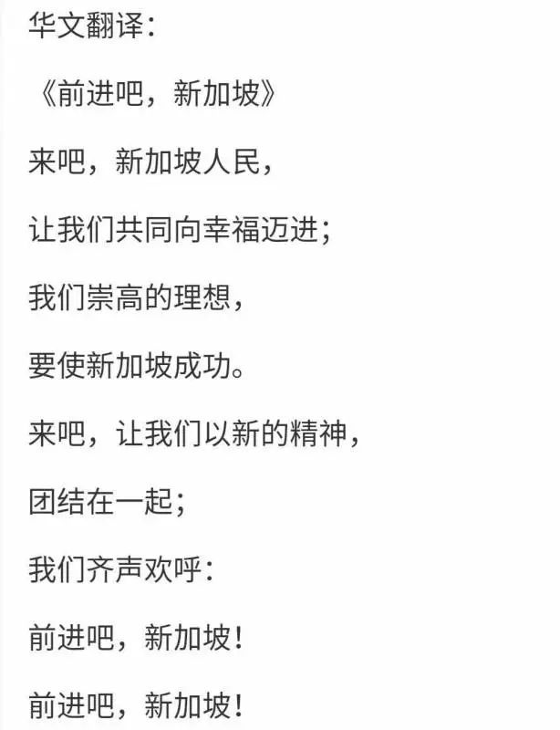 更有意思的是,新加坡的国歌《前进吧,新加坡》不仅是用马来语谱写的,而且法律规定只能用马来语演唱,英语、华语、泰米尔语有国歌的译文,却不能用来演唱。