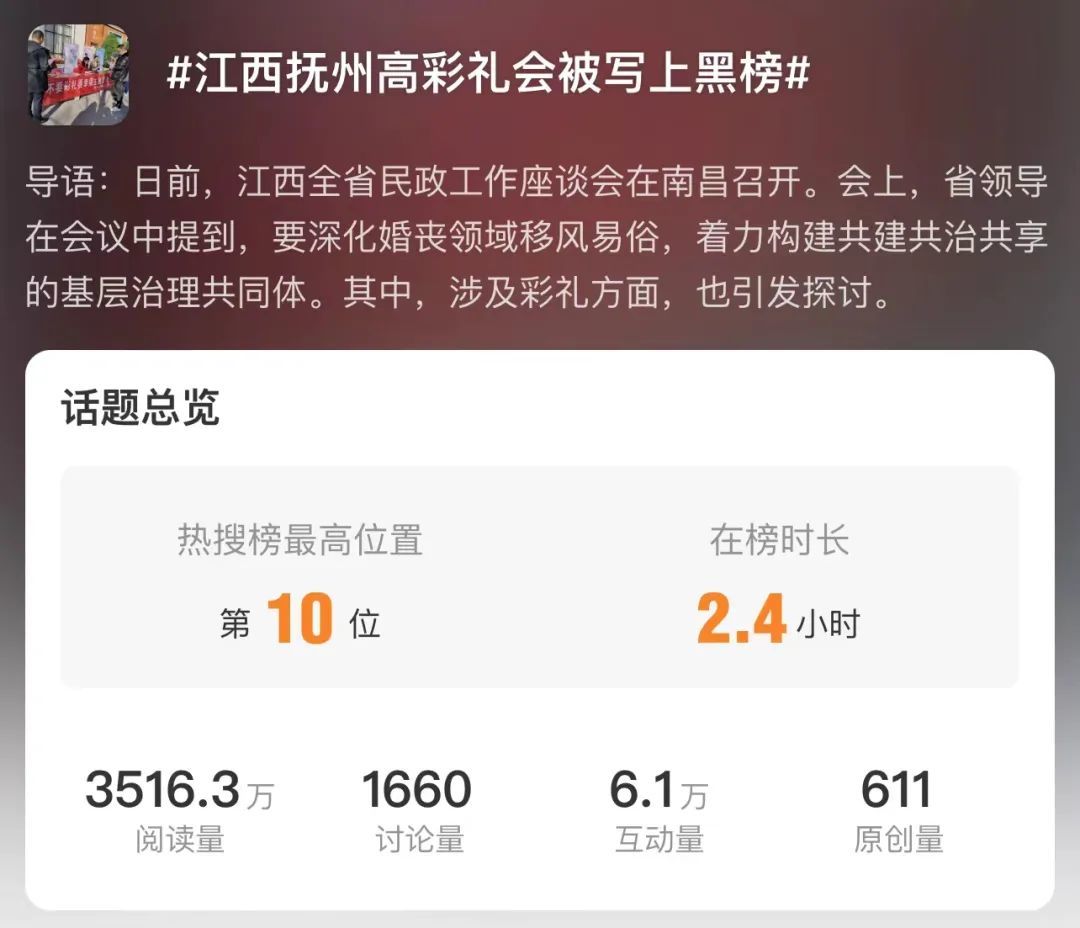 #江西抚州高彩礼会被写上黑榜#话题一出现,就冲上了微博热搜榜。