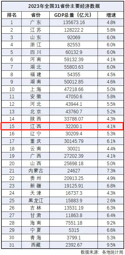可惜的是,在新公布的2023年全国31省份GDP数据排名中,江西以大约3.2万亿元的总量位列全国第15名,增速4.1%,跑输全国大盘(5.2%)。
