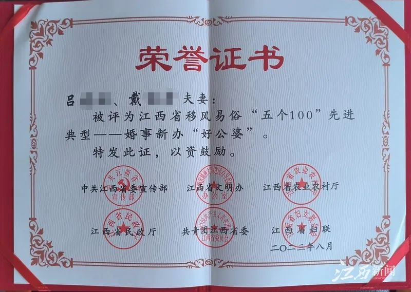赣州市安远县并非唯一。江西萍乡的一对夫妇更是因为嫁女娶媳“零彩礼”,在去年获得了江西省移风易俗“五个100”先进典型——婚事新办“好公婆”荣誉。
