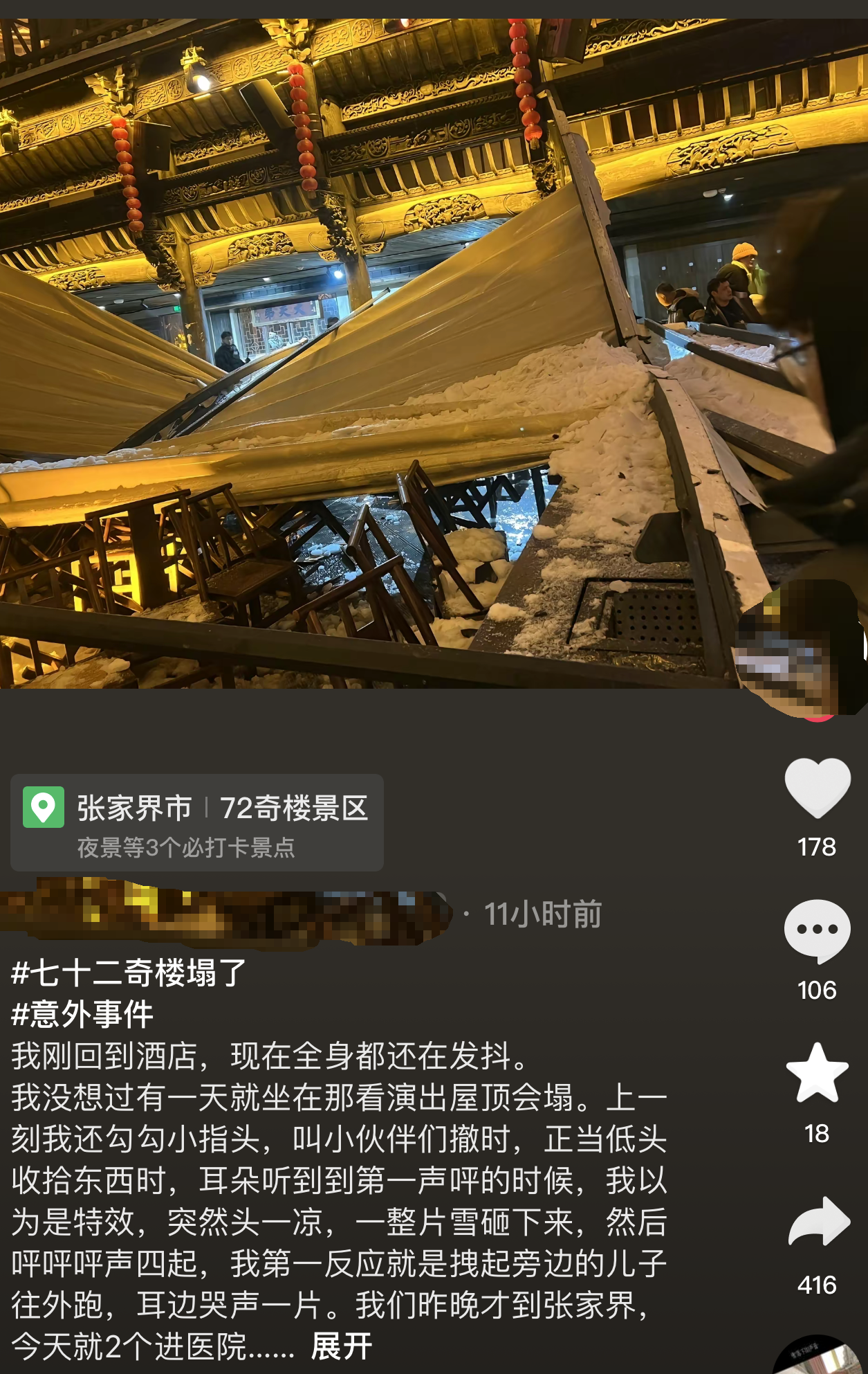 另据央视新闻报道2024年2月3日21时许,湖南省张家界市永定区“七十二奇楼”内一钢结构顶棚发生部分倒塌,造成多人受伤。