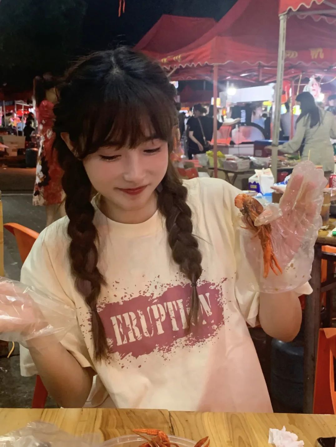 在剥虾的过程中,头发掉下来了,我们自己浅浅的拨弄一下,然后用求助的眼神看着他。