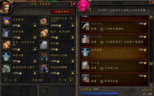 除了公会福利之外,公会等级和公会成就可以解锁公会商品奖励,解锁后可在主城公会商人处购买(有公会声望要求)。奖励包括头腿披风传家宝、公会战旗、传送披风、宠物坐骑、大餐大锅配方等等。