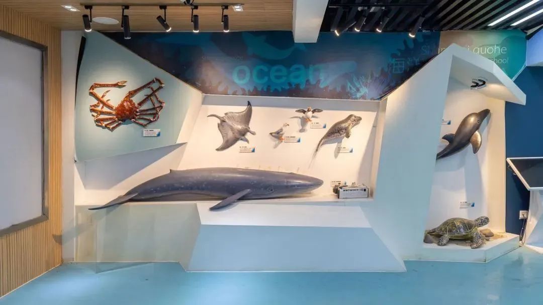 视觉感受区,配有高清大屏幕投影、海洋生物模型、视频自主观看台等,在这里学生可以近距离享受声光影带来的感官盛宴,追寻好奇,放飞思想。