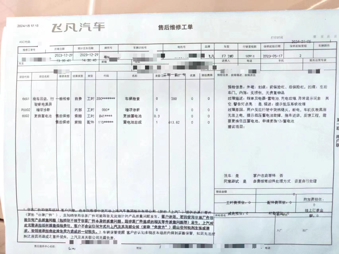 车辆出现故障后,于先生将车辆送至当地的飞凡服务门店进行检修。于先生提供的检修记录显示,车辆“线束及电器-蓄电池,充电故障”“警告灯点亮,提示低压系统故障”,需要更换车辆的低压蓄电池。
