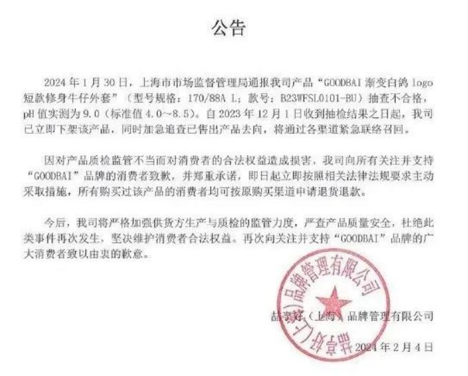 2月4日,针对GOODBAI牛仔外套抽检不合格,品牌官方微博@GOODBAI_official 回应称:自2023年12月1日收到抽检结果之日起,公司已立即下架该产品,同时加急追查已售出产品去向,将通过各渠道紧急联络召回。