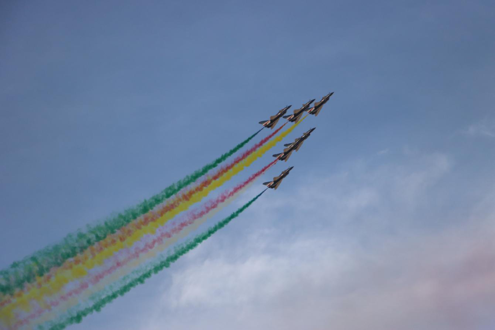 当日的飞行表演中,空军八一飞行表演队连续做出“四机垂直开花”“五机水平开花”“六机分组开花”等一系列高难度表演动作。由象征中沙两国国旗的“红黄白绿”四种颜色组成的彩色拉烟,在高空绽放开花,时而如牵牛花开、金钟倒挂,时而如天女散花、五彩绚烂,让利雅得的上空更加色彩斑斓。
