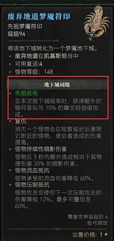 4、根据杀怪效率一趟可以升1-2级,这时候可以去找映月对话领宝袋,开宝袋后可以得到2-3个带【先祖庇佑】词缀的噩梦徽记。