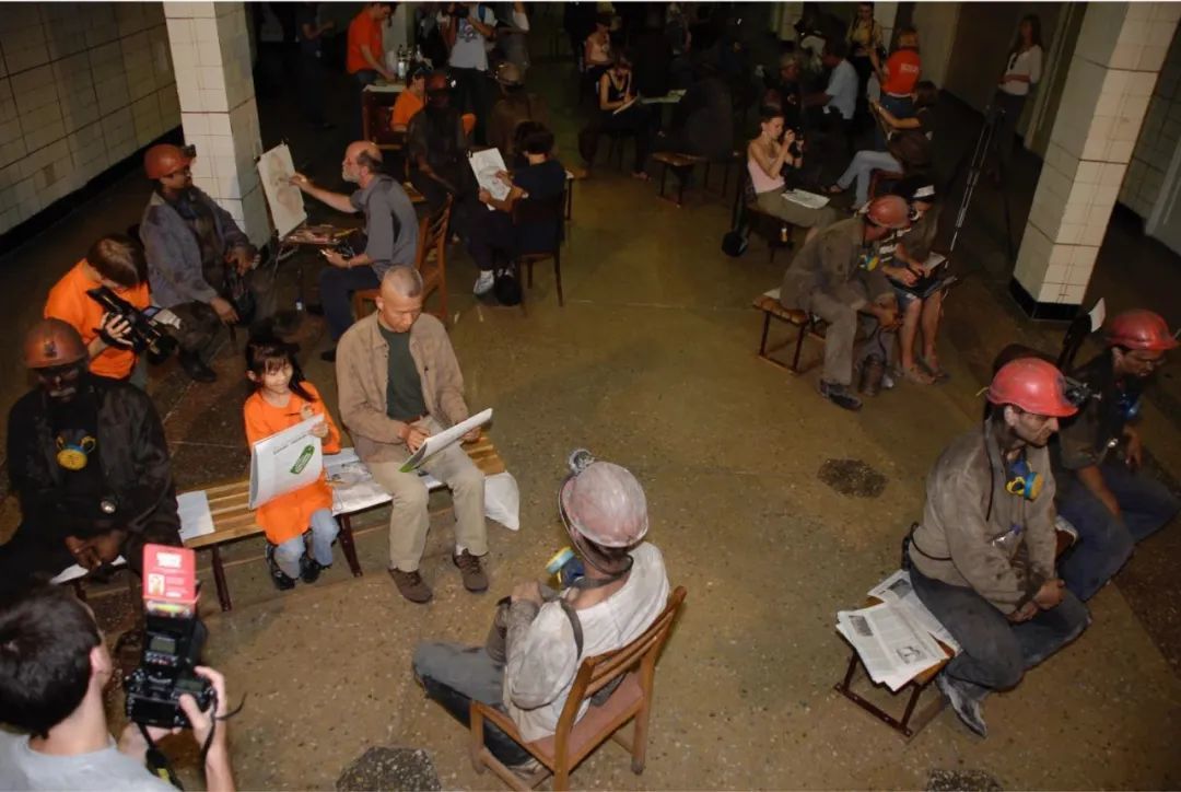 ▲蔡国强与乌克兰的艺术家写生当地矿工,由此创作火药画装置,展出于顿涅兹克Izolyatsia的个展,2011。Andrei Parahin摄