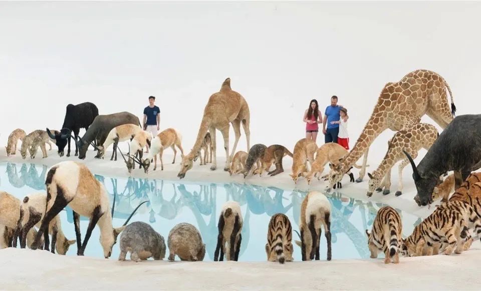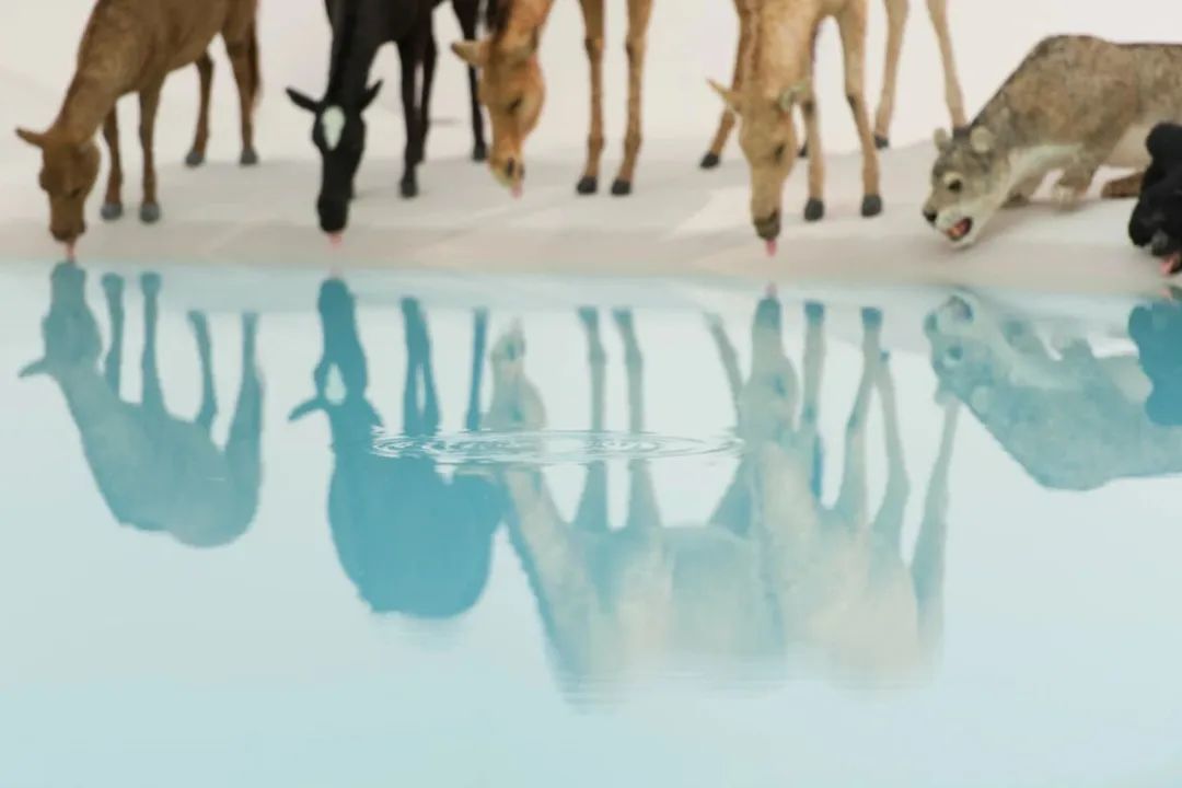 ▲蔡国强装置作品《遗产》:99只温顺、凶猛的动物(复制品)同饮一池水,2013。澳大利亚昆士兰美术馆暨现代美术馆(QAGOMA)提供