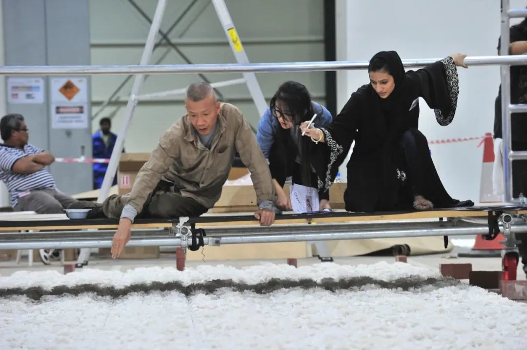 ▲蔡国强在阿拉伯当代艺术博物馆(Mathaf)工作人员引导下,为火药陶瓷作品《脆弱》播撒火药,炸出阿拉伯语“脆弱”,2011。林毅摄