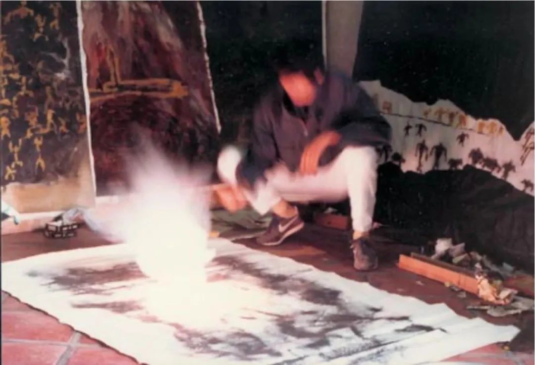 ▲蔡国强于泉州家中创作火药画,1985