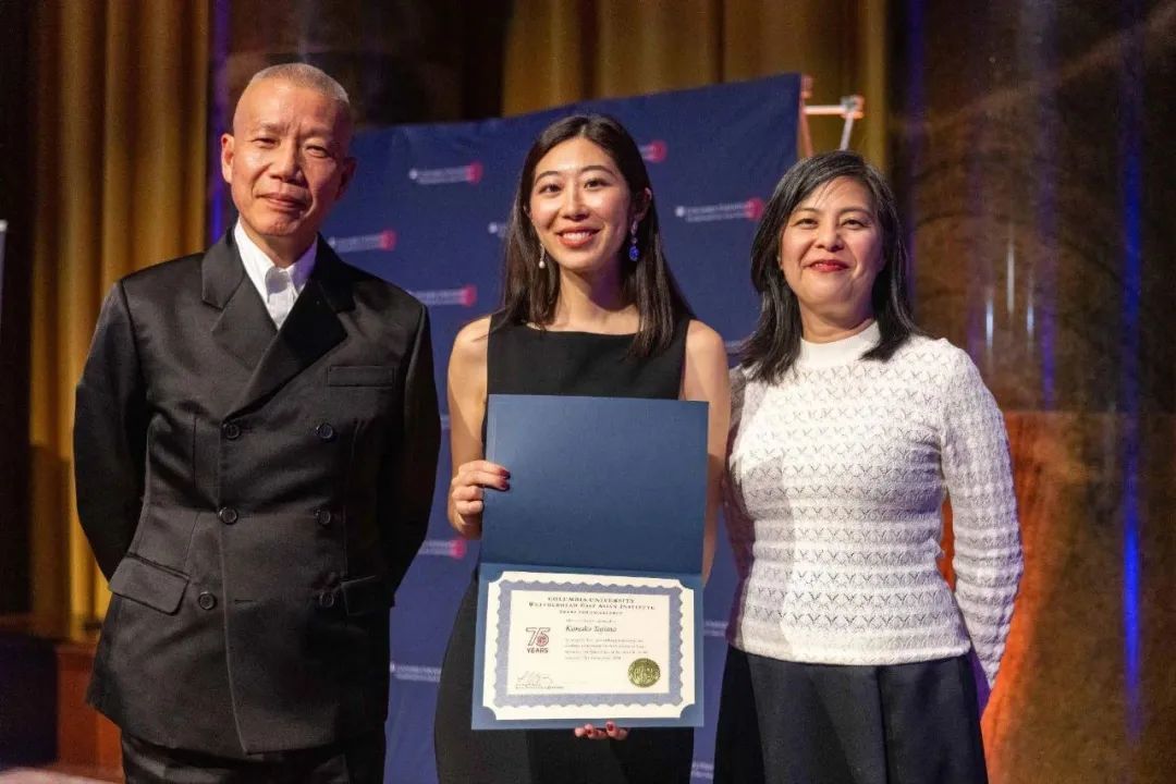 ▲蔡国强、“卓越奖”学生得主田岛加奈子与林郁沁,2024。纽约哥伦比亚大学提供