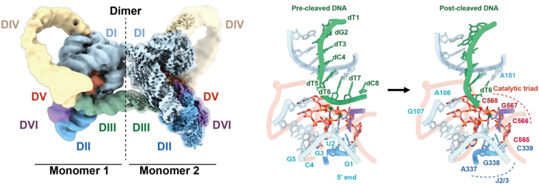 研究人员利用冷冻电镜获得了HYER1的高分辨三维结构(3.0 Å),发现HYER1以同源二聚体的形式存在,并揭示HYER1水解切割DNA的机理。HYER1通过一段暴露的单链RNA (6 nt)区域,TRS (Target Recognition Site),识别并招募DNA底物,将DNA捕获在结构域V所形成的催化核心中,通过经典的双镁离子机制催化DNA水解。